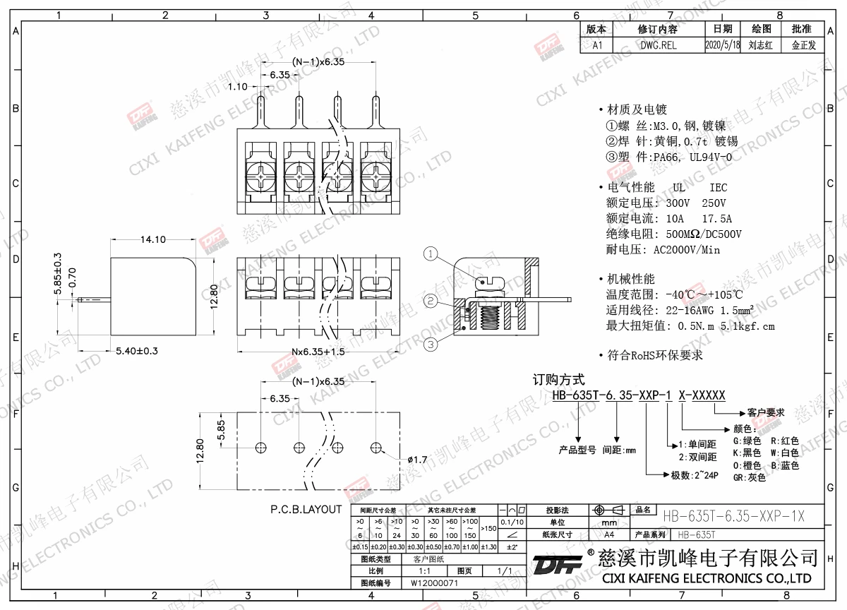 栅栏式接线端子 材质电镀:材质及电镀(Material)螺丝(Screw):M2.5,钢,镀镍Steel,NiPlated端子(Pinheader):黄铜,0.7t镀锡Brass,Tinplated塑件(Housing):PA66,UL94V-0·电气性能(Electrical)额定电压(RatedVoltage):300V额定电流(RatedCurrent):16A绝缘电阻