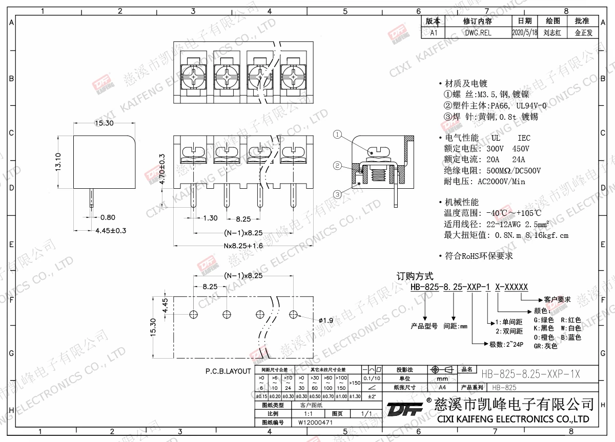 材质电镀:M3.5 钢,镀镍端子:黄铜,0.7t 镀镍塑件: PA66,UL94V-0电气性能ULIEC额定电压300V 450V 额定电流20A24A绝缘电阻500MΩ/DC500V耐电压AC2000V/1min使用线径22-12AWG 2.5mm²机械性能温度范围-40℃~+105℃ 扭矩0.8N.m 7.02Lb.in