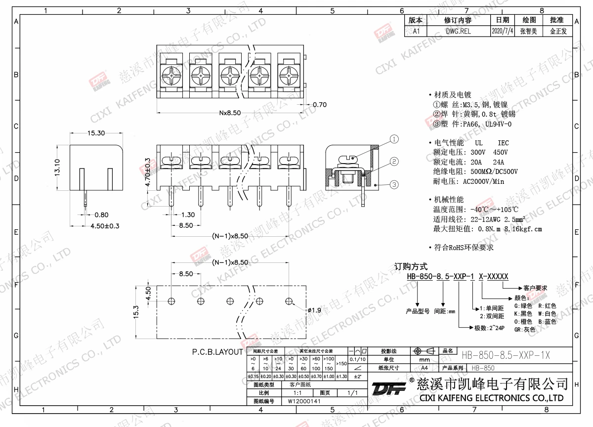 材质电镀:M3.5 钢,镀镍端子:黄铜,0.7t 镀镍塑件: PA66,UL94V-0电气性能ULIEC额定电压300V 450V 额定电流20A24A绝缘电阻500MΩ/DC500V耐电压AC2000V/1min使用线径22-12AWG 2.5mm²机械性能温度范围-40℃~+105℃ 扭矩0.8N.m 7.02Lb.in