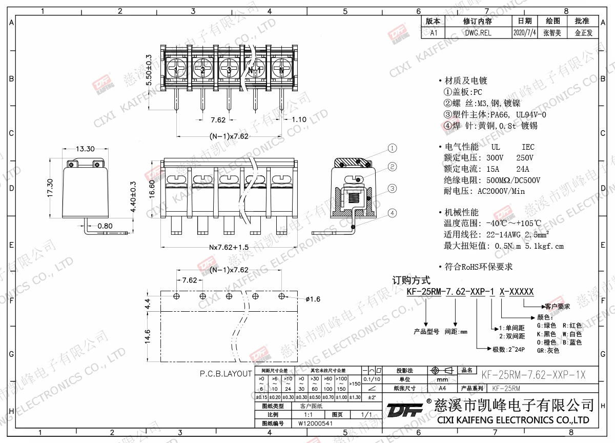栅栏式接线端子 材质电镀:M3.0 钢,镀镍端子:黄铜,0.8t 镀镍塑件: PA66,UL94V-0电气性能ULIEC额定电压300V 250V 额定电流15A24A绝缘电阻500MΩ/DC500V耐电压AC2000V/1min使用线径22-14AWG 2.5mm²机械性能温度范围-40℃~+105℃ 扭矩0.5N.m 4.4Lb.in