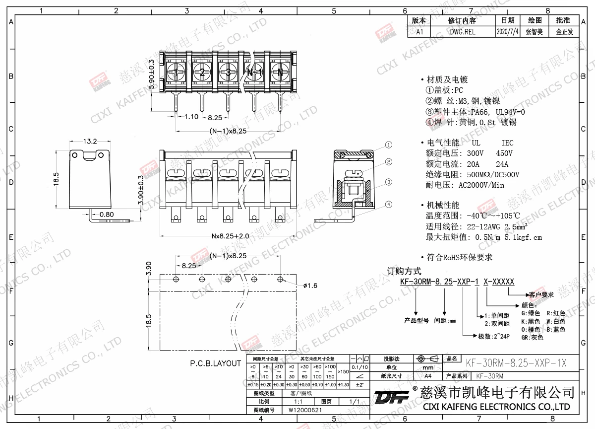栅栏式接线端子 材质电镀:M3.0 钢,镀镍端子:黄铜,0.8t 镀镍塑件: PA66,UL94V-0电气性能ULIEC额定电压300V 450V 额定电流20A24A绝缘电阻500MΩ/DC500V耐电压AC2000V/1min使用线径22-12AWG 2.5mm²机械性能温度范围-40℃~+105℃ 扭矩0.5N.m 4.4Lb.in