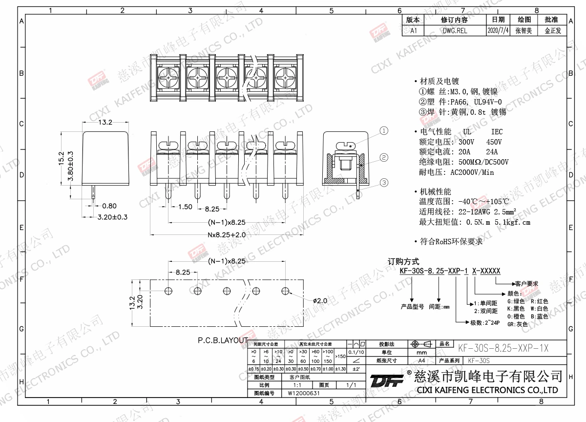 材质电镀:M3.0 钢,镀镍端子:黄铜,0.8t 镀镍塑件: PA66,UL94V-0电气性能ULIEC额定电压300V 450V 额定电流20A24A绝缘电阻500MΩ/DC500V耐电压AC2000V/1min使用线径22-12AWG 2.5mm²机械性能温度范围-40℃~+105℃ 扭矩0.5N.m 4.4Lb.in