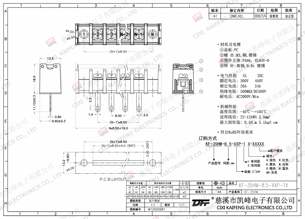 栅栏式接线端子 材质电镀:M3.0 钢,镀镍端子:黄铜,0.8t 镀镍塑件: PA66,UL94V-0电气性能ULIEC额定电压300V 450V 额定电流20A24A绝缘电阻500MΩ/DC500V耐电压AC2000V/1min使用线径22-12AWG 2.5mm²机械性能温度范围-40℃~+105℃ 扭矩0.5N.m 4.4Lb.in