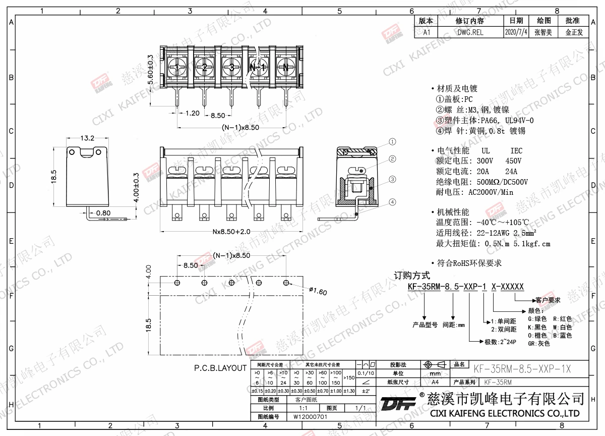 材质电镀:M3.0 钢,镀镍端子:黄铜,0.8t 镀镍塑件: PA66,UL94V-0电气性能ULIEC额定电压300V 450V 额定电流20A24A绝缘电阻500MΩ/DC500V耐电压AC2000V/1min使用线径22-12AWG 2.5mm²机械性能温度范围-40℃~+105℃ 扭矩0.5N.m 4.4Lb.in
