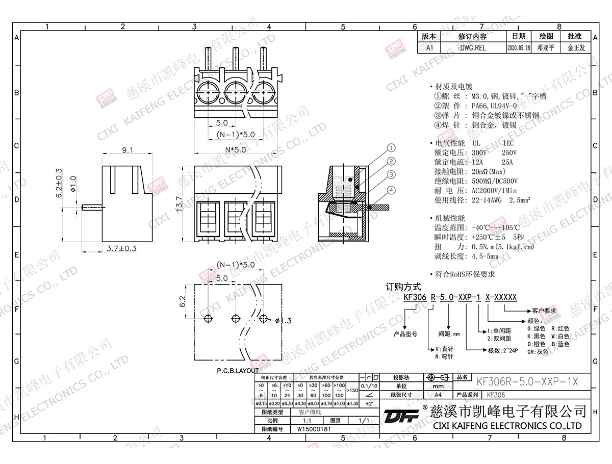 固定式连接端子 材质电镀:①螺 丝 : M3.0 钢,镀锌,"-"字槽 ②塑 件 : PA66, UL94V-0 ③弹 片 : 磷青铜镀镍或不锈钢