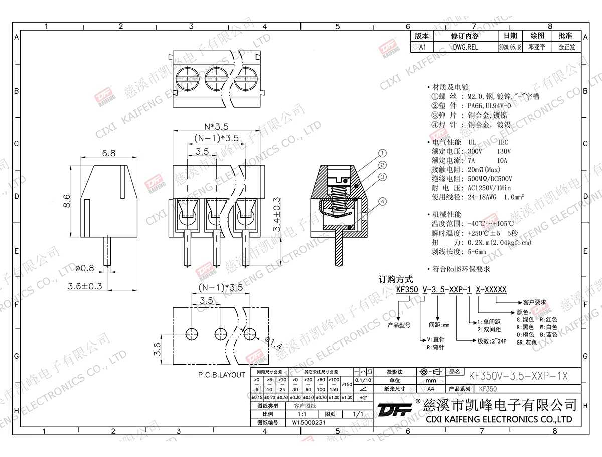 固定式连接端子 材质电镀:①螺 丝 : M2.0 钢,镀锌,"-"字槽 ②塑 件 : PA66, UL94V-0 ③弹 片 : 磷青铜镀镍或不锈钢
