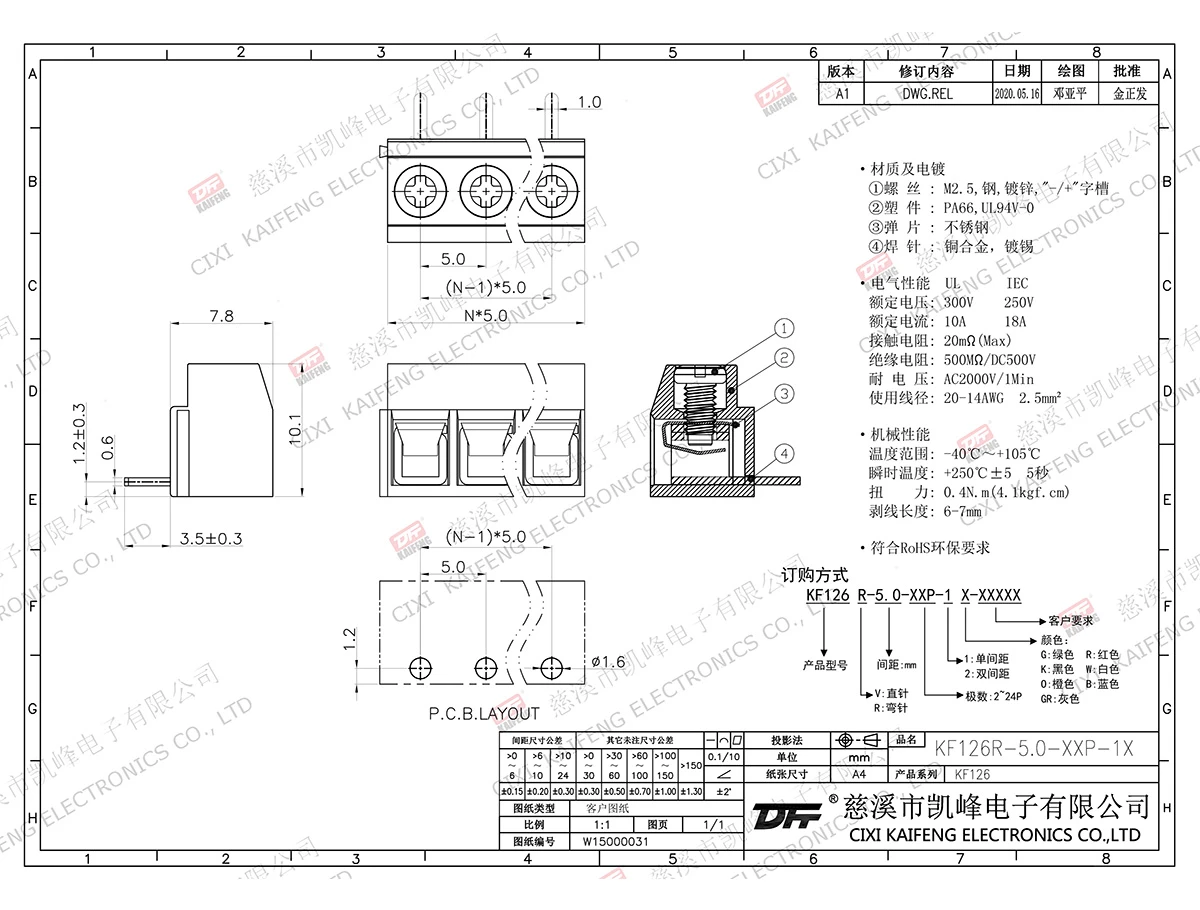 固定式连接端子 材质电镀:①螺 丝 : M2.5 钢 镀锌,"-"字槽 ②塑 件 : PA66, UL94V-0 ③弹 片 : 磷青铜镀镍或不锈钢
