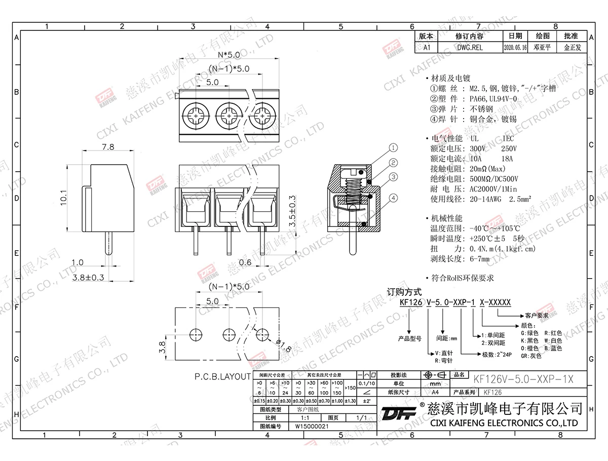 固定式连接端子 材质电镀:材质及电镀 ①螺 絲 : M2.5 鋼 鍍鋅,"±"字槽 ②塑 件 : PA66, UL94V- 0 ③彈片 : 磷青銅鍍鎳或不銹鋼 &nbs