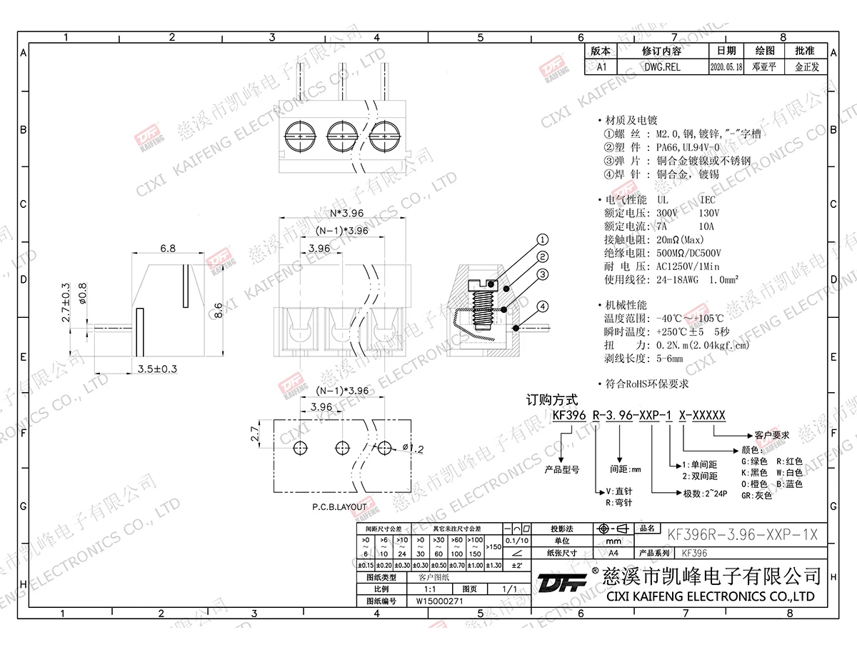 固定式连接端子 材质电镀:①螺 丝 : M2.0 钢,镀锌,"-"字槽 ②塑 件 : PA66, UL94V-0 ③弹 片 : 磷青铜镀镍或不锈钢 ④焊 针 :