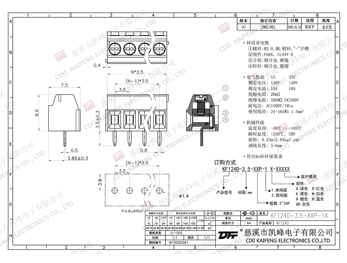 材质电镀:螺丝:M2.0钢,镀锌塑件:PA66,UL94V-0·电气性能额定电压:150V额定电流:10A接触电阻:20mΩ绝缘电阻:5000MΩ/1000V耐电压:AC1500V/1min使用线径:26-16AWG1.5mm²·机械性能(Mechanical)温度范围:-40℃~+105℃瞬时温度:+250℃,5秒剥线长度:5-6mm