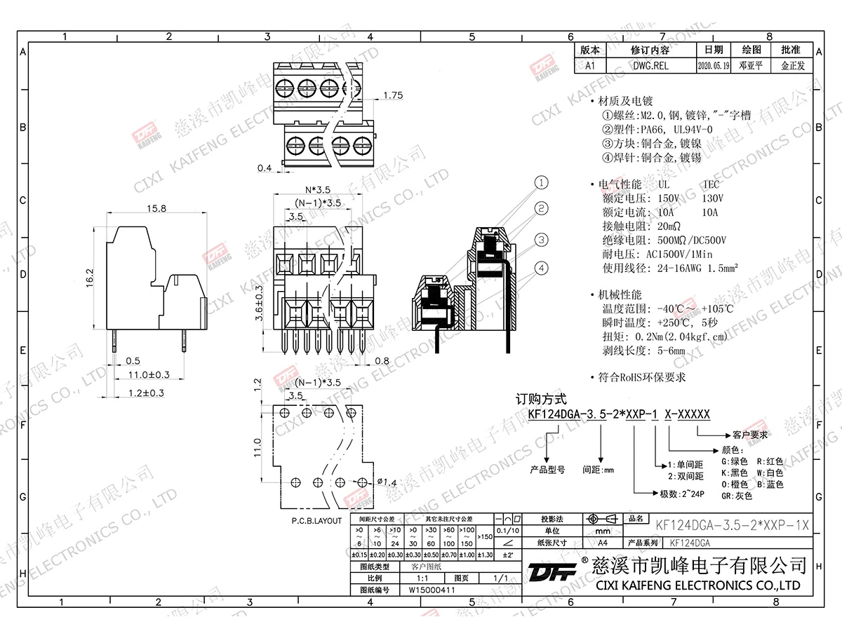 固定式连接端子 材质电镀:①螺 丝 : M2.0 钢,镀锌,"-"字槽 ②塑 件 : PA66, UL94V-0 ③方 盒 :黄铜,镀镍 ④焊 针