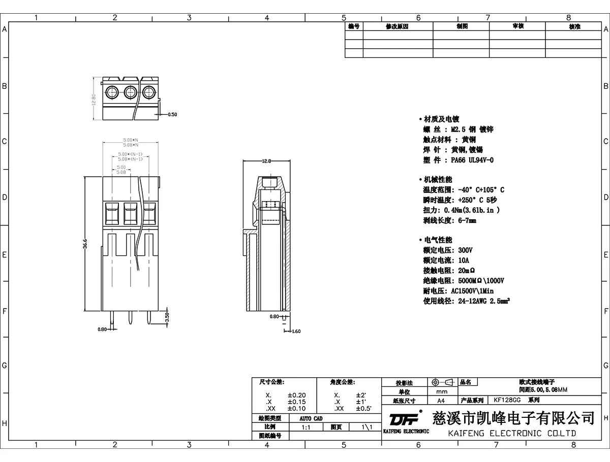 固定式连接端子 材质电镀:螺丝:M2.5,钢,镀锌触点:黄铜,镀镍焊针:黄铜,镀锡塑件:PA66,UL94V-0·电气性能额定电压:300V额定电流:10A接触电阻:20mΩ绝缘电阻:5000MΩ/1000V耐电压:AC1500V/1Min使用线径:24-12AWG2.5mm²·机械性能温度范围:-40℃~+105℃瞬时温度:+250℃,5秒扭矩:0.4Nm(3.6lb.in)剥线长度:6-7mm