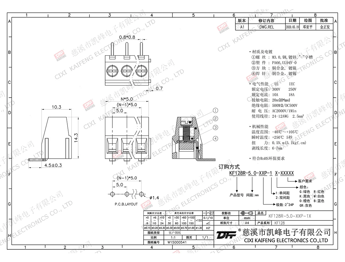 固定式连接端子 材质电镀:螺丝(Screw):M2.0钢,镀锌(Steel,ZincPlated)塑件(Housing):PA66,UL94V-0·电气性能(Electrical)额定电压(RatedVoltage):300V额定电流(RatedCurrent):10A接触电阻(ContactResistance):20mΩ绝缘电阻(InsulationResistance):5