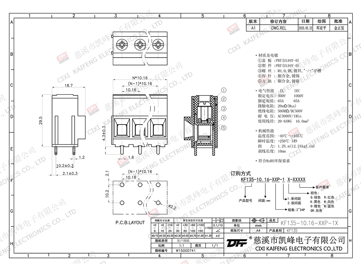 材质电镀:材质及电镀(Material)螺丝(Screw):M2.0钢,镀锌(Steel,ZincPlated)塑件(Housing):PA66,UL94V-0·电气性能(Electrical)额定电压(RatedVoltage):600V额定电流(RatedCurrent):52A接触电阻(ContactResistance):20mΩ绝缘电阻(InsulationResistance):5