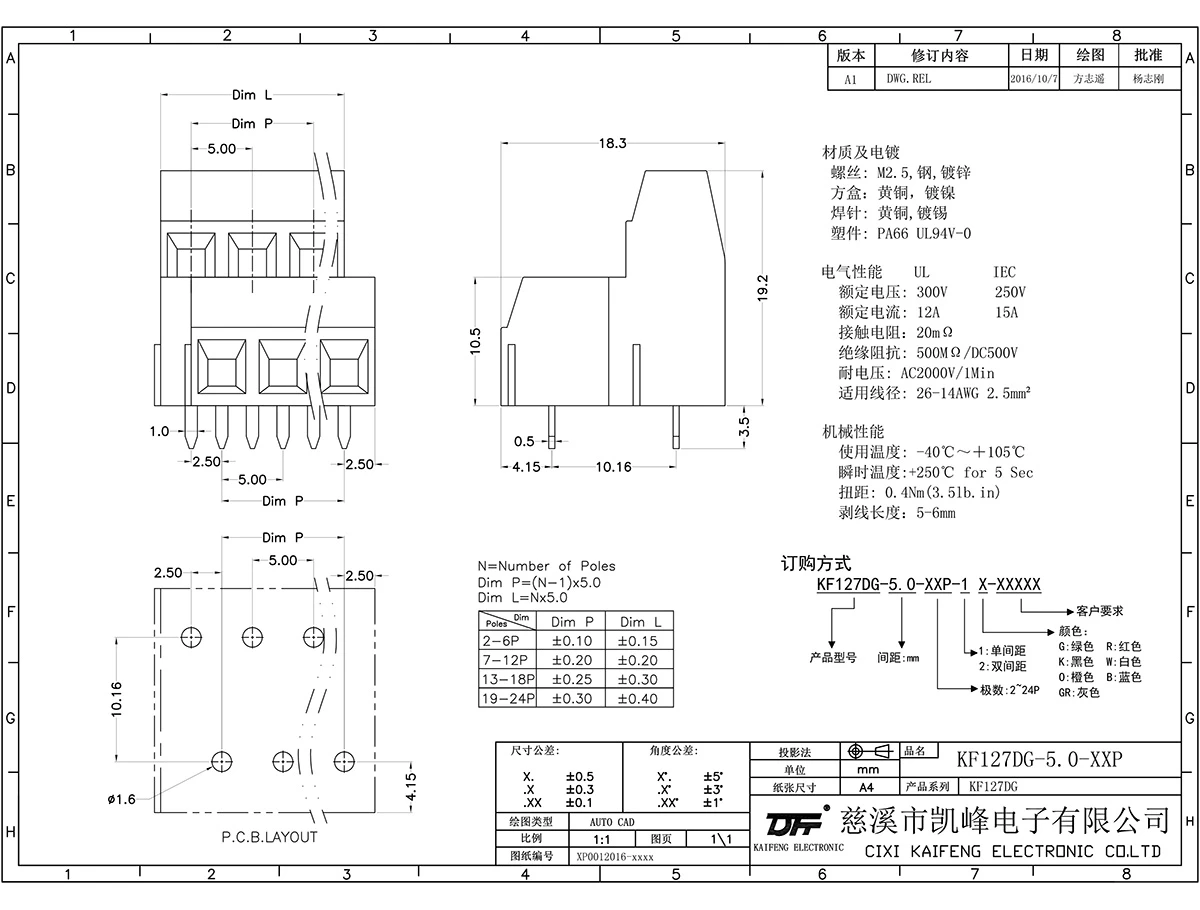 固定式连接端子 材质电镀:材质及电镀①螺丝:M2.5钢,镀锌,"-"字槽②塑件:PA66,UL94V-0③方盒:黄铜,镀镍④焊针:黄铜,镀锡电气性能ULIEC额定电压300V250V额定电流12A15A接触电阻20mΩ(Max)绝缘电阻500MΩ\DC500V耐电压AC2000V\1Min使用线径26-14AWG2.5mm²机械性能温度范围-40℃~+105℃瞬时温度+250℃,5sec扭矩0.4N