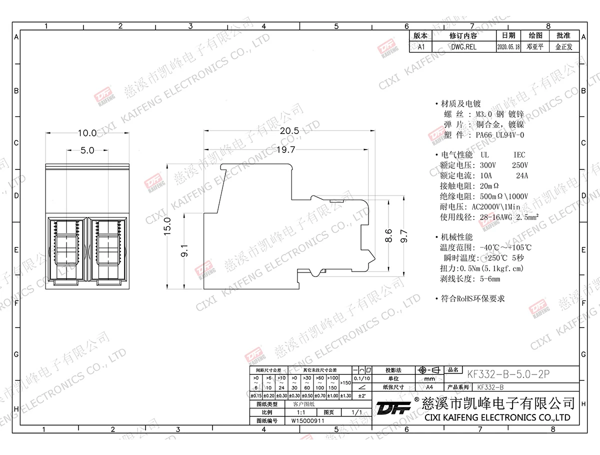 材质电镀:材质及电镀螺丝:M3.0钢,镀锌,"-"字槽塑件:PA66,UL94V-0弹片:磷青铜,镀镍焊针:-电气性能ULIEC额定电压300V250V额定电流10A24A接触电阻20mΩ(Max)绝缘电阻500MΩ\DC500V耐电压AC2000V\1Min使用线径28-16AWG2.5mm²机械性能温度范围-40℃~+105℃瞬时温度+250℃,5sec扭矩0.5N.m4.43L