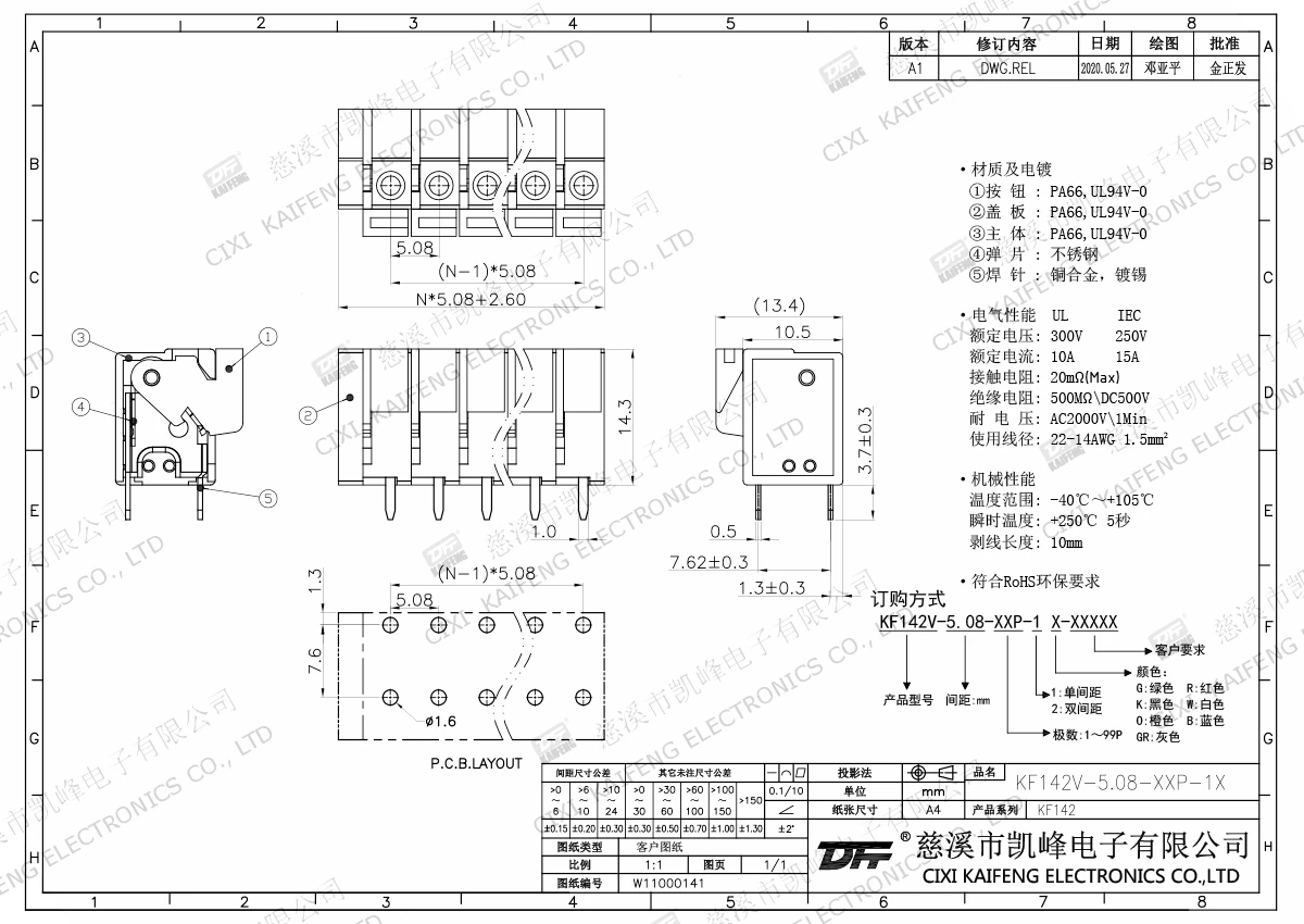 材质电镀:①按钮:PA66,UL94V-0②盖板:PA66,UL94V-0③主体:PA66,UL94V-0④弹片:不锈钢⑤焊针:黄铜,镀锡电气性能ULIEC额定电压300V 250V 额定电流10A15A接触电阻20mΩ绝缘电阻500MΩ/DC500V耐电压AC2000V/1min使用线径22-14AWG 1.5mm²机械性能温度范围-40℃~+105℃ 瞬时温度+250℃,5sec