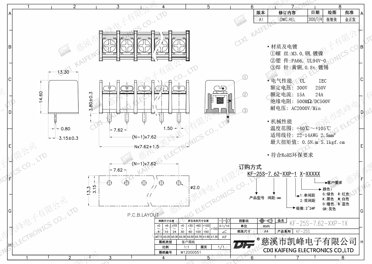 材质电镀:M3.0 钢,镀镍端子:黄铜,0.8t 镀镍塑件: PA66,UL94V-0电气性能ULIEC额定电压300V 250V 额定电流15A24A绝缘电阻500MΩ/DC500V耐电压AC2000V/1min使用线径22-14AWG 2.5mm²机械性能温度范围-40℃~+105℃ 扭矩0.5N.m 4.4Lb.in