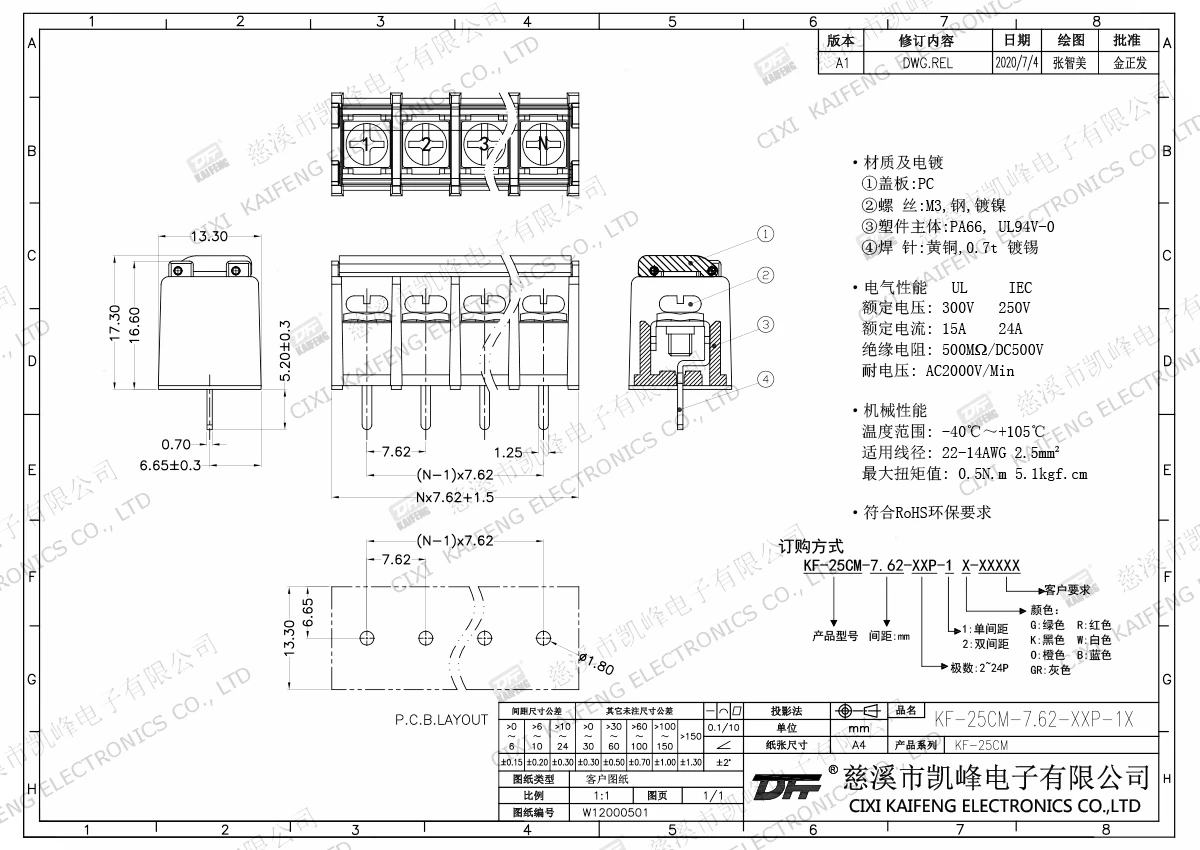 材质电镀:M3.0 钢,镀镍端子:黄铜,0.7t 镀镍塑件: PA66,UL94V-0电气性能ULIEC额定电压300V 250V 额定电流15A24A绝缘电阻500MΩ/DC500V耐电压AC2000V/1min使用线径22-14AWG 2.5mm²机械性能温度范围-40℃~+105℃ 扭矩0.5N.m 4.4Lb.in