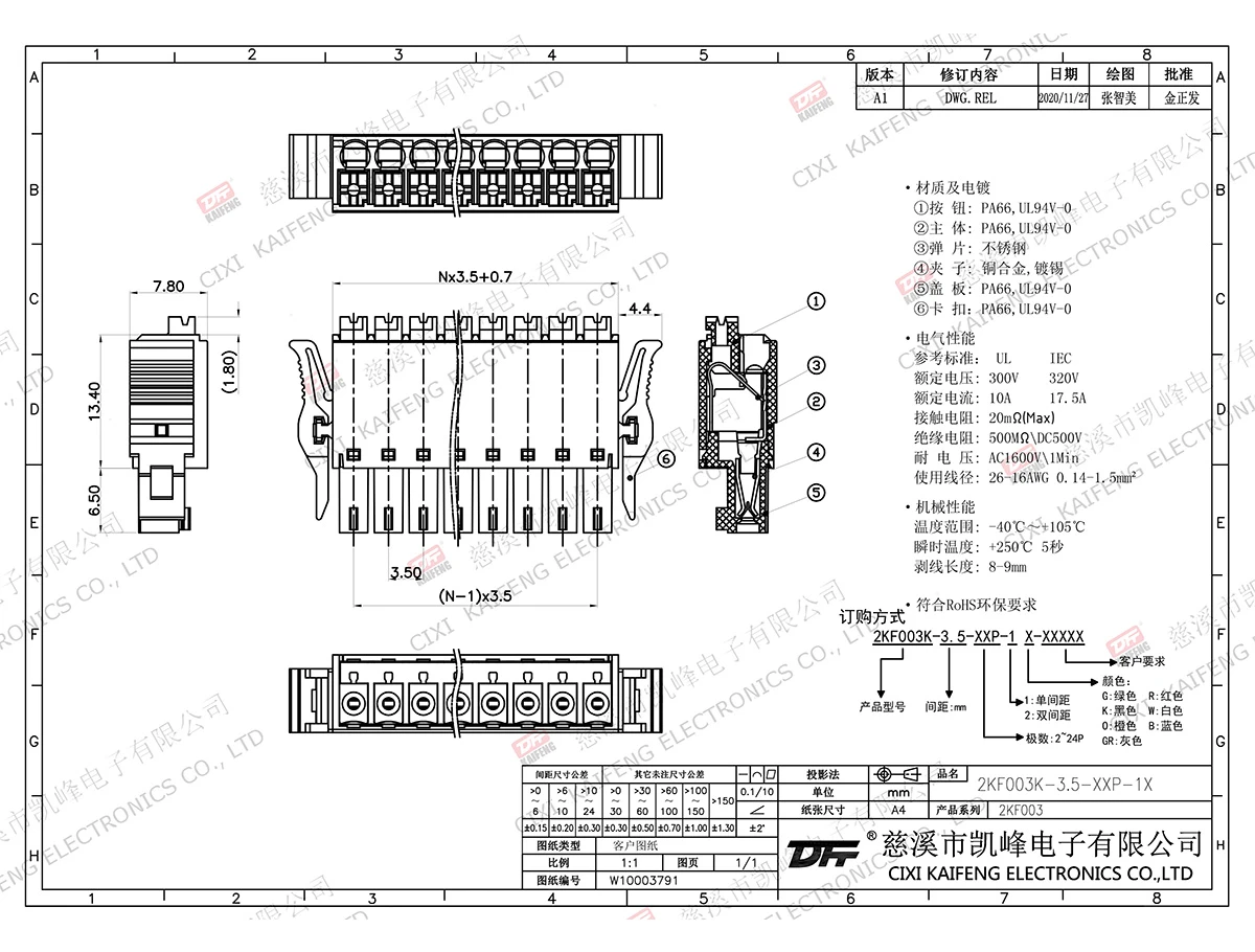 插拔式连接端子 材质电镀:①弹片:PA66,UL94V-0 ②夹子 : 不绣钢3 按钮:磷青铜电气性能UL IEC 额定电压300V 320V &