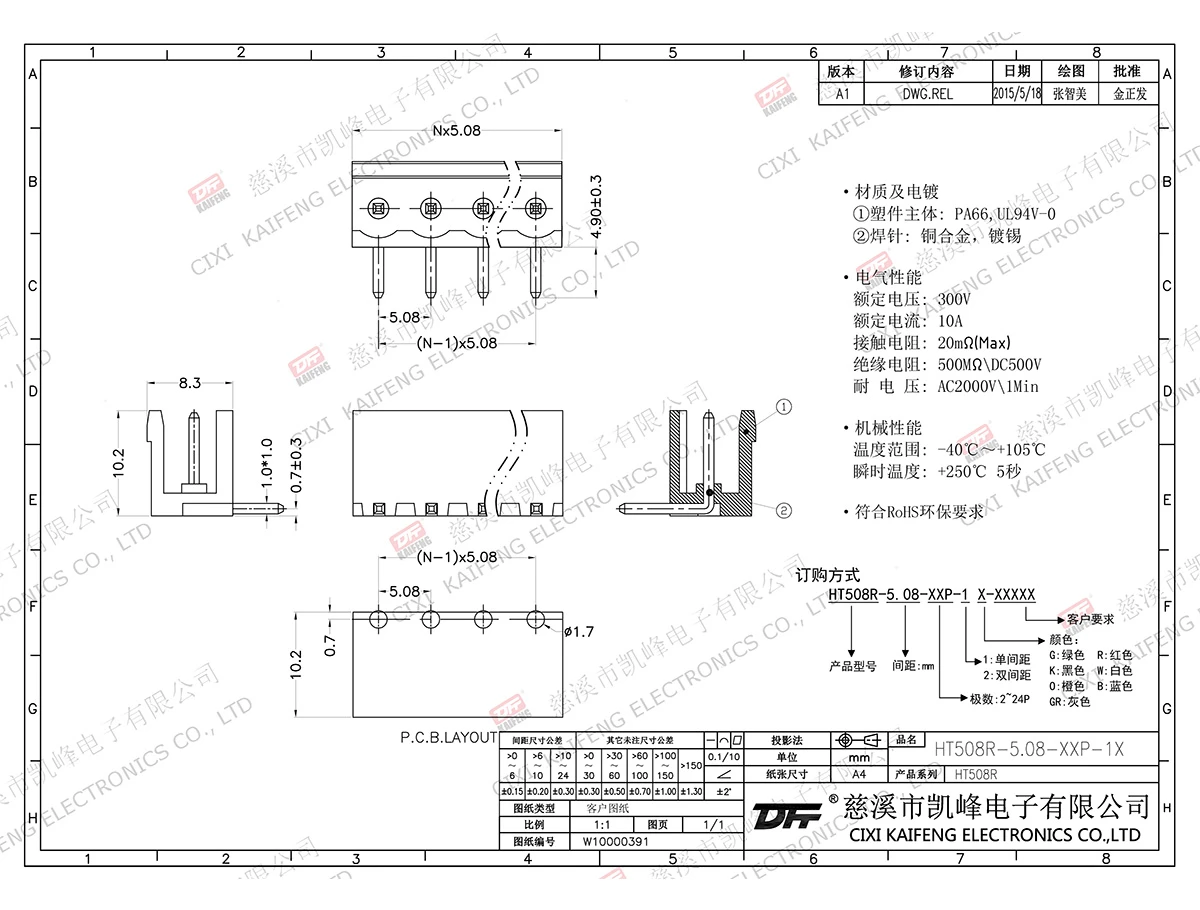 插拔式连接端子 材质电镀:材质及电镀螺丝: -触点: -焊针: 黄铜,镀锡塑件: PA66,UL94V-0电气性能ULIEC额定电压300V 320V 额定电流15A20A接触电阻20mΩ绝缘电阻500MΩ/DC500V耐电压AC2000V/1min使用线径-机械性能温度范围-40℃~+105℃ 瞬时温度+250℃, 5sec扭矩-剥线长度-