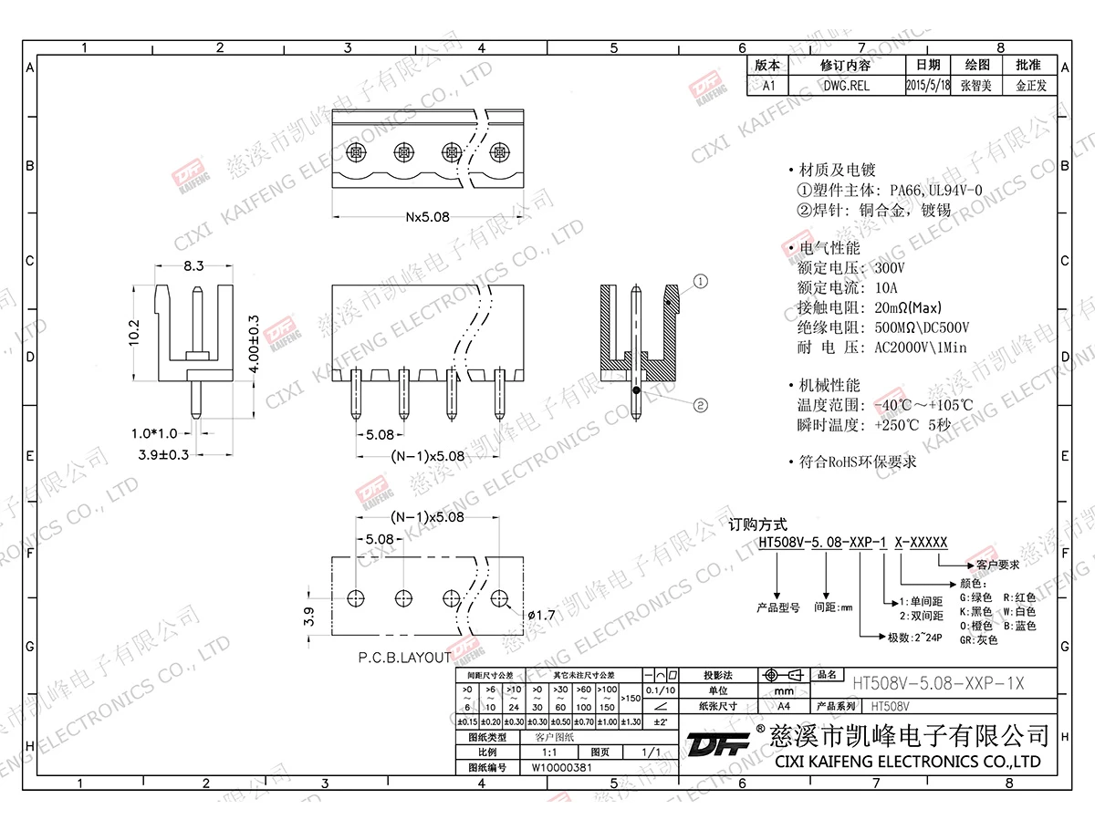插拔式连接端子 材质电镀:材质及电镀螺丝: -触点: -焊针: 黄铜,镀锡塑件: PA66,UL94V-0电气性能ULIEC额定电压300V 320V 额定电流15A20A接触电阻20mΩ绝缘电阻500MΩ/DC500V耐电压AC2000V/1min使用线径-机械性能温度范围-40℃~+105℃ 瞬时温度+250℃, 5sec扭矩-剥线长度-