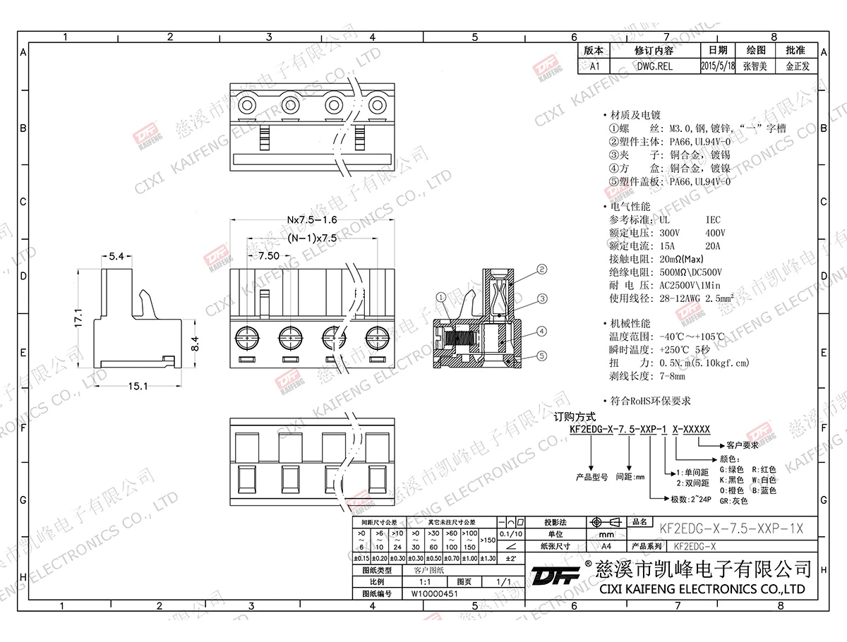 插拔式连接端子 材质电镀:M2.5,钢,镀锌触点: 磷青铜焊针: -塑件: PA66,UL94V-0电气性能ULIEC额定电压300V 400V 额定电流15A20A接触电阻20mΩ绝缘电阻500MΩ/DC500V耐电压AC2500V/1min使用线径28-12AWG 2.5mm²机械性能温度范围-40℃~+105℃ 瞬时温度+250℃, 5s
