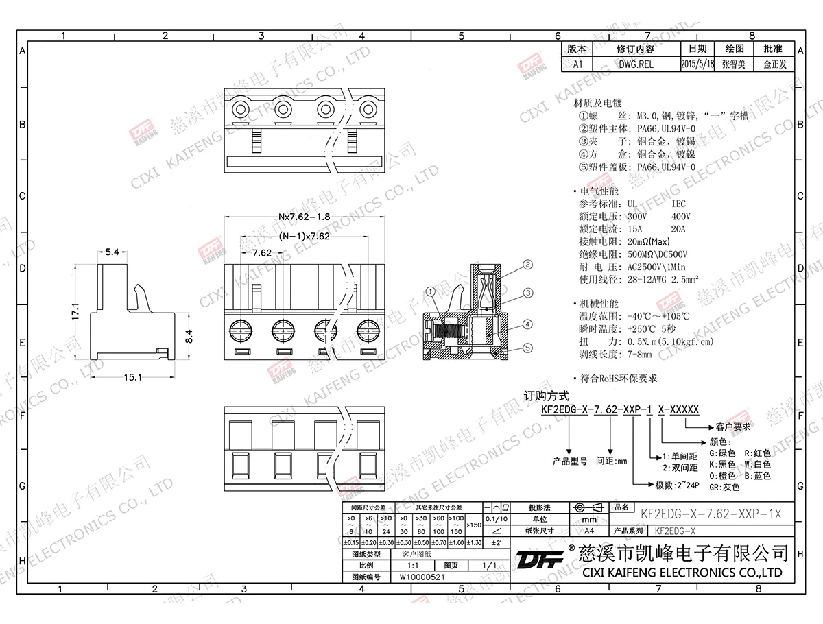 材质电镀:M2.5,钢,镀锌触点: 磷青铜焊针: -塑件: PA66,UL94V-0电气性能ULIEC额定电压300V 400V 额定电流15A20A接触电阻20mΩ绝缘电阻500MΩ/DC500V耐电压AC2500V/1min使用线径28-12AWG 2.5mm²机械性能温度范围-40℃~+105℃ 瞬时温度+250℃, 5s