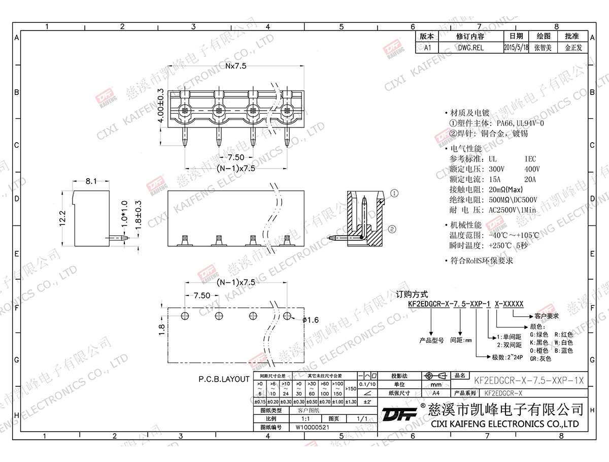 插拔式连接端子 材质电镀:触点: -焊针: 黄铜,镀锡塑件: PA66,UL94V-0电气性能ULIEC额定电压300V 400V 额定电流15A20A接触电阻20mΩ绝缘电阻500MΩ/DC500V耐电压AC2500V/1min使用线径-机械性能温度范围-40℃~+105℃ 瞬时温度+250℃, 5sec扭矩-剥线长度-