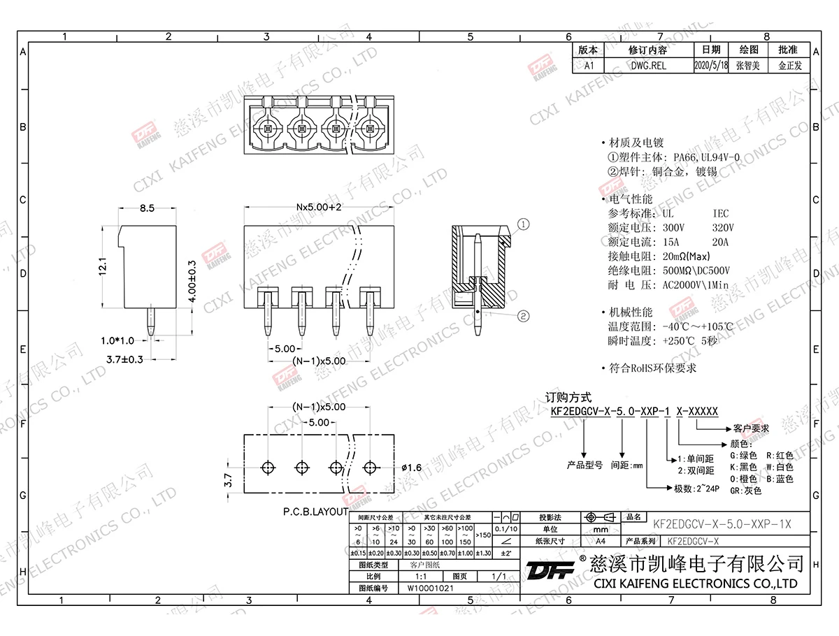 插拔式连接端子 材质电镀:触点: -焊针: 黄铜,镀锡塑件: PA66,UL94V-0电气性能ULIEC额定电压300V 320V 额定电流15A20A接触电阻20mΩ绝缘电阻500MΩ/DC500V耐电压AC2000V/1min使用线径-机械性能温度范围-40℃~+105℃ 瞬时温度+250℃,5sec扭矩-剥线长度-