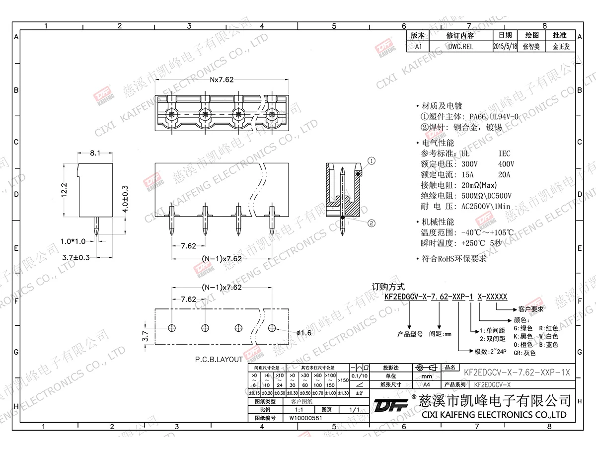 插拔式连接端子 材质电镀:M3.0,钢夹子: -触点: -焊针: 黄铜,镀锡塑件: PA66,UL94V-0电气性能ULIEC额定电压300V 400V 额定电流15A20A接触电阻20mΩ绝缘电阻500MΩ/DC500V耐电压AC2500V/1min使用线径-机械性能温度范围-40℃~+105℃ 瞬时温度+250℃, 5sec扭矩-剥线长度-