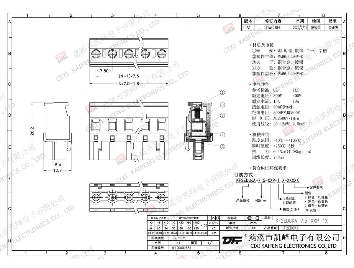 插拔式连接端子 材质电镀:M2.5,钢,镀锌触点: 磷青铜焊针: -塑件: PA66,UL94V-0电气性能ULIEC额定电压300V 400V 额定电流15A10A接触电阻20mΩ绝缘电阻500MΩ/DC500V耐电压AC2500V/1min使用线径28-12AWG 2.5mm²机械性能温度范围-40℃~+150℃ 瞬时温度+250℃, 5s