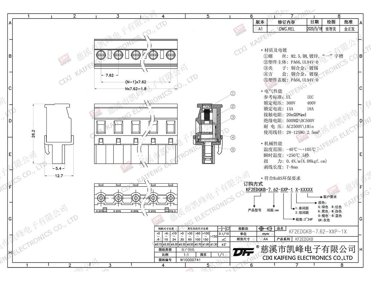 插拔式连接端子 材质电镀: M2.5,钢,镀锌触点: 磷青铜焊针: -塑件: PA66,UL94V-0电气性能ULIEC额定电压300V 400V 额定电流15A10A接触电阻20mΩ绝缘电阻500MΩ/DC500V耐电压AC2500V/1min使用线径28-12AWG 2.5mm²机械性能温度范围-40℃~+150℃ 瞬时温度+250℃, 5s