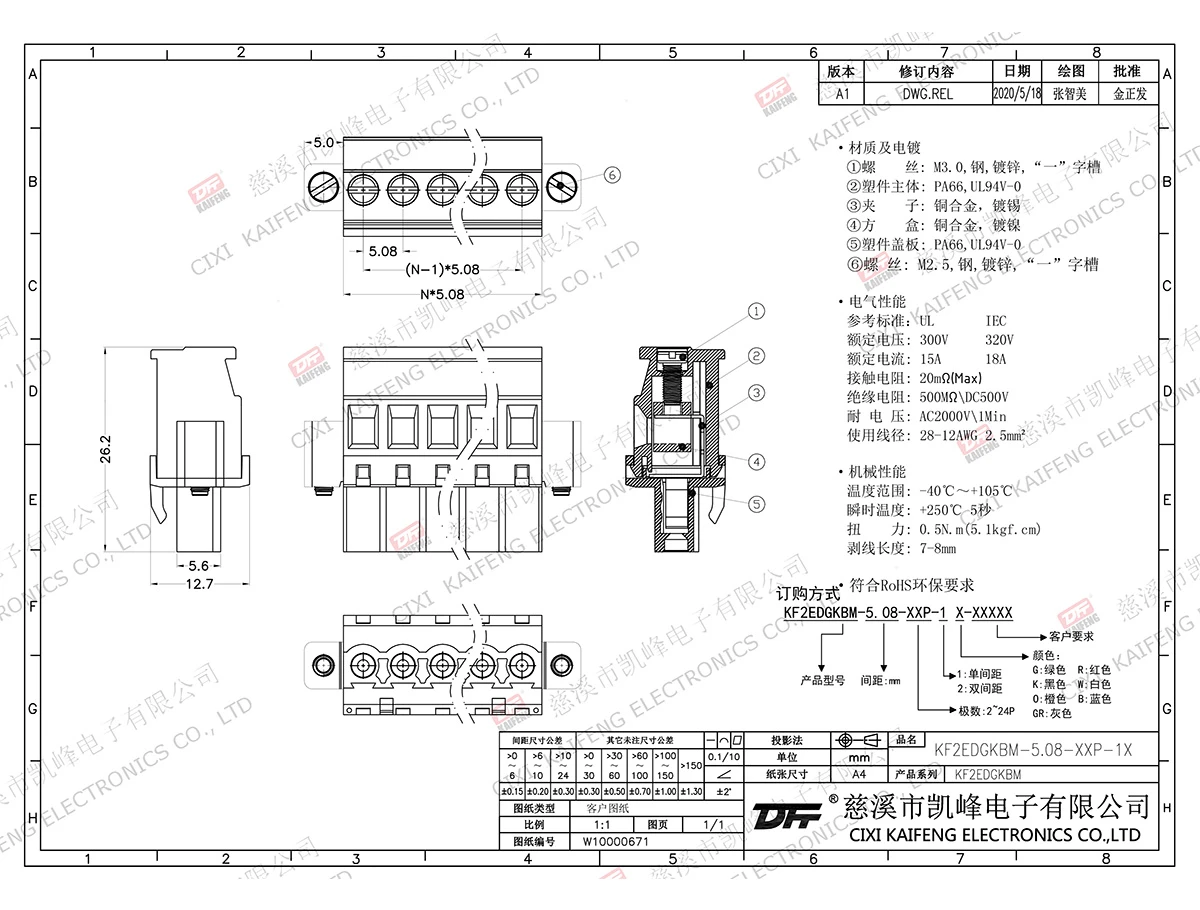 材质电镀:M3.0,钢,镀锌触点: 磷青铜方块: --塑件: PA66,UL94V-0电气性能ULIEC额定电压300V 320V 额定电流15A18A接触电阻20mΩ绝缘电阻500MΩ/DC500V耐电压AC2000V/1min使用线径28-12AWG 2.5mm²机械性能温度范围-40℃~+105℃ 瞬时温度+250℃, 5