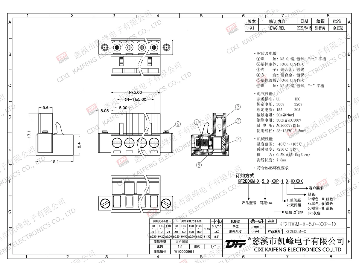 插拔式连接端子 材质电镀:M3.0 钢 镀锌 ,"一"字槽触点: -焊针:-塑件: PA66,UL94V-0电气性能ULIEC额定电压300V 320V 额定电流15A20A接触电阻20mΩ绝缘电阻500MΩ/DC500V耐电压AC2000V/1min使用线径28-12AWG 2.5㎜²机械性能温度范围-40℃~+105℃ 瞬时温度+