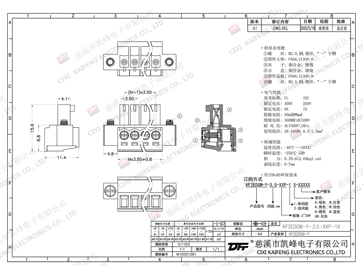 插拔式连接端子 材质电镀:M2.0,钢,镀锌触点: 磷青铜焊针: -塑件: PA66,UL94V-0电气性能ULIEC额定电压300V 250V 额定电流8A7A接触电阻20mΩ绝缘电阻500MΩ/DC500V耐电压AC1500V/1min使用线径28-16AWG 0.5-1.5mm²机械性能温度范围-40℃~+150℃ 瞬时温度+250℃,