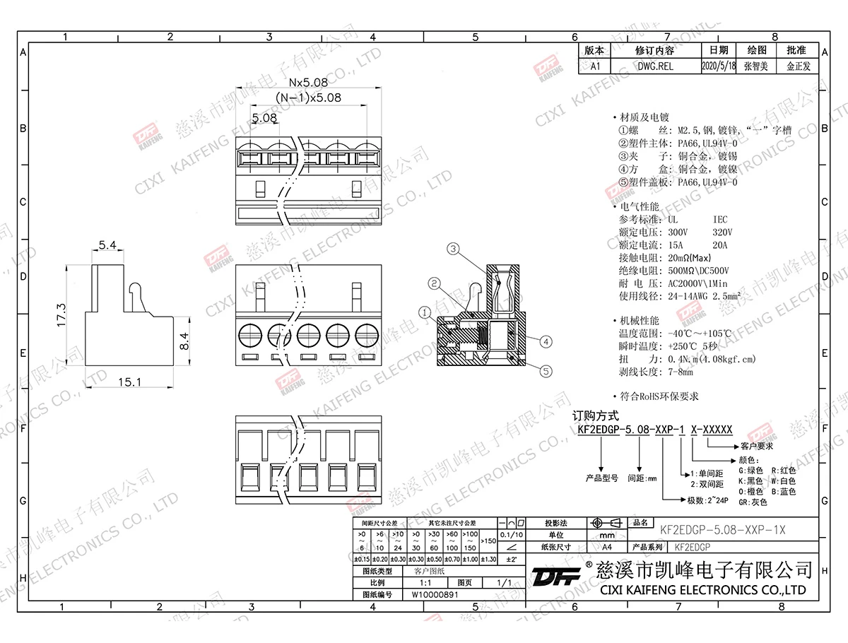 插拔式连接端子 材质电镀:材质及电镀螺丝: M2.5,钢,镀锌触点: 磷青铜焊针: -塑件: PA66,UL94V-0电气性能ULIEC额定电压300V 320V 额定电流15A20A接触电阻20mΩ绝缘电阻500MΩ/DC500V耐电压AC2000V/1min使用线径24-14AWG 2.5mm²机械性能温度范围-40℃~+105℃ 瞬时温度+250℃, 5s