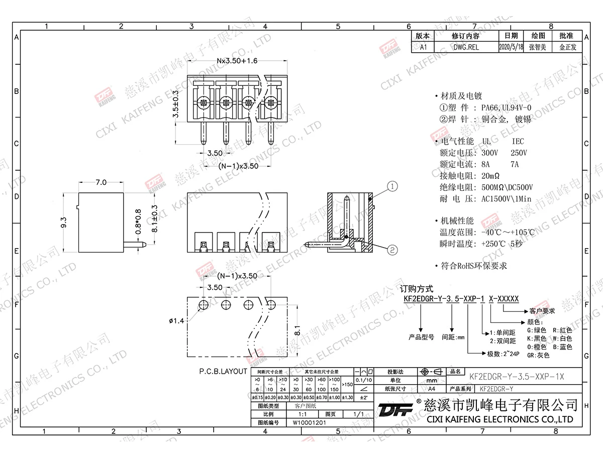 插拔式连接端子 材质电镀:材质及电镀螺丝: -触点: -焊针: 黄铜,镀锡塑件: PA66,UL94V-0电气性能ULIEC额定电压300V 250V 额定电流8A7A接触电阻20mΩ绝缘电阻500MΩ/DC500V耐电压AC1500V/1min使用线径-机械性能温度范围-40℃~+105℃ 瞬时温度+250℃,5sec扭矩-剥线长度-