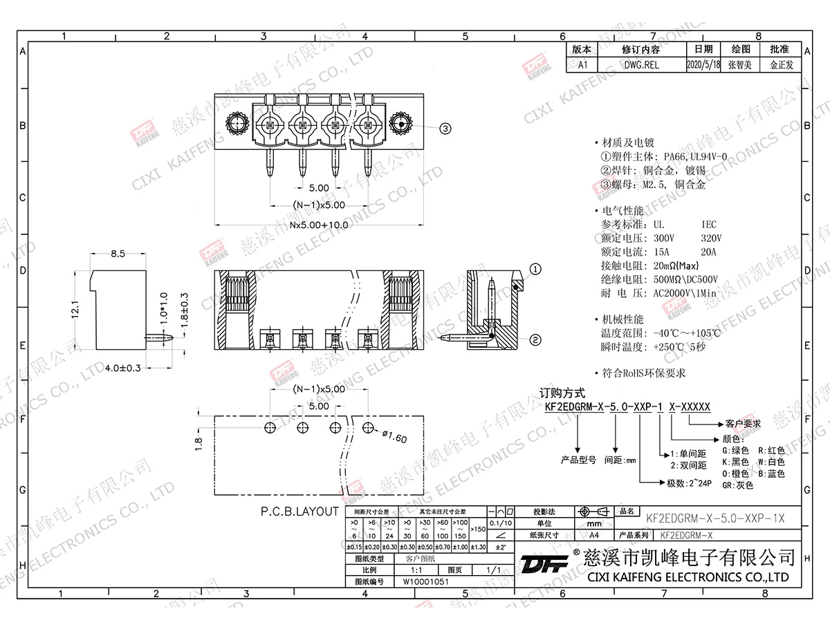插拔式连接端子 材质电镀:材质及电镀螺丝:-触点: -焊针: 黄铜,镀锡塑件: PA66,UL94V-0电气性能ULIEC额定电压300V 320V 额定电流15A20A接触电阻20mΩ绝缘电阻500MΩ/DC500V耐电压AC2000V/1min使用线径-机械性能温度范围-40℃~+105℃ 瞬时温度+250℃, 5sec扭矩-剥线长度-