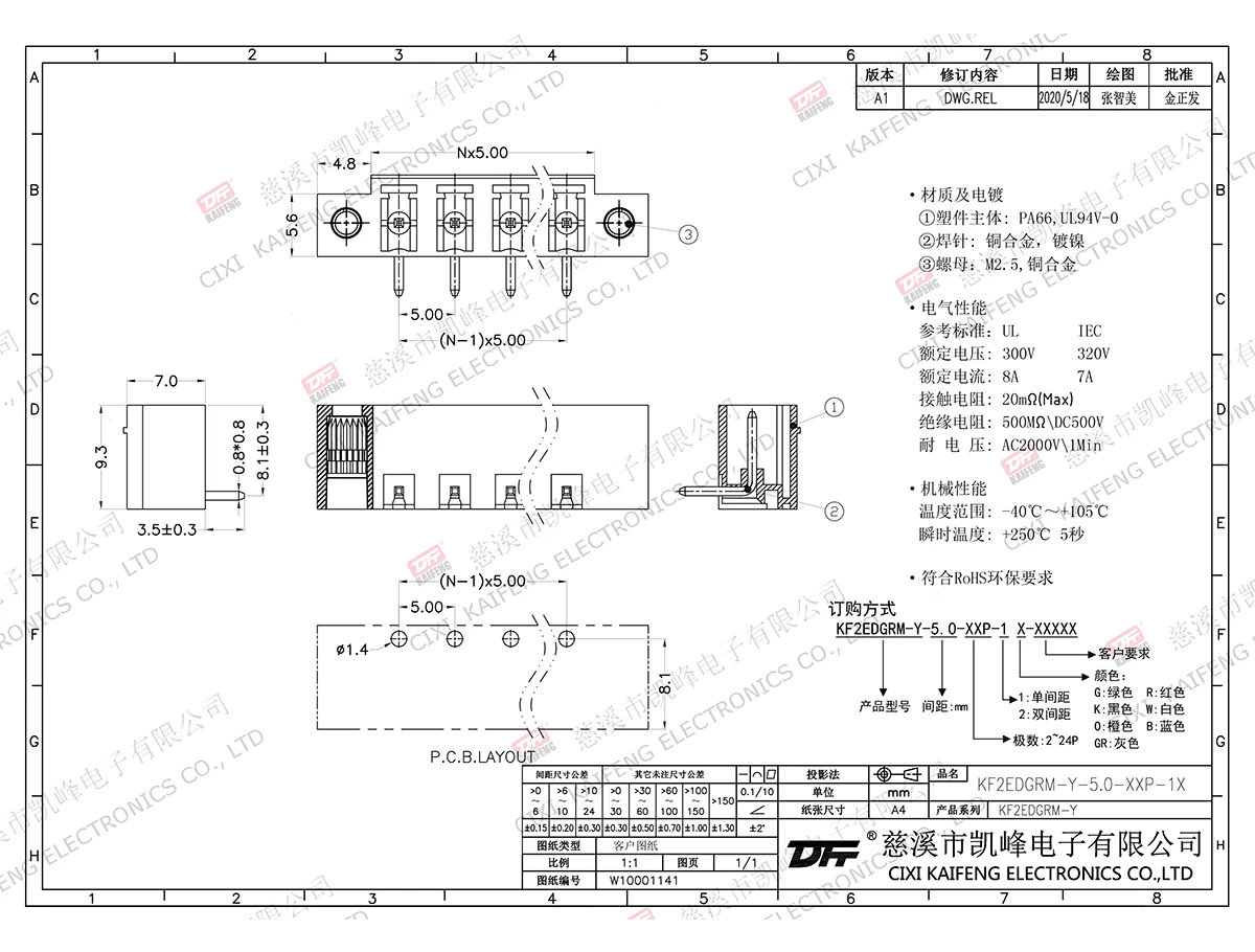 材质电镀:材质及电镀螺丝: -触点: -焊针: 黄铜,镀锡塑件: PA66,UL94V-0电气性能ULIEC额定电压300V 250V 额定电流8A7A接触电阻20mΩ绝缘电阻500MΩ/DC500V耐电压AC1500V/1min使用线径-机械性能温度范围-40℃~+105℃ 瞬时温度+250℃/ 5sec扭矩-剥线长度-