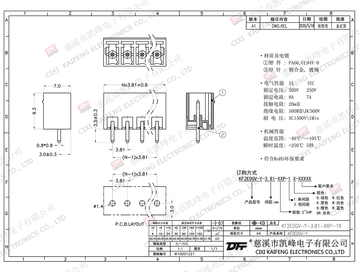 插拔式连接端子 材质电镀:触点: -焊针: 黄铜,镀锡塑件: PA66,UL94V-0电气性能ULIEC额定电压300V 250V 额定电流8A7A接触电阻20mΩ绝缘电阻500MΩ/DC500V耐电压AC1500V/1min使用线径-机械性能温度范围-40℃~+105℃ 瞬时温度+250℃,5sec扭矩-剥线长度-