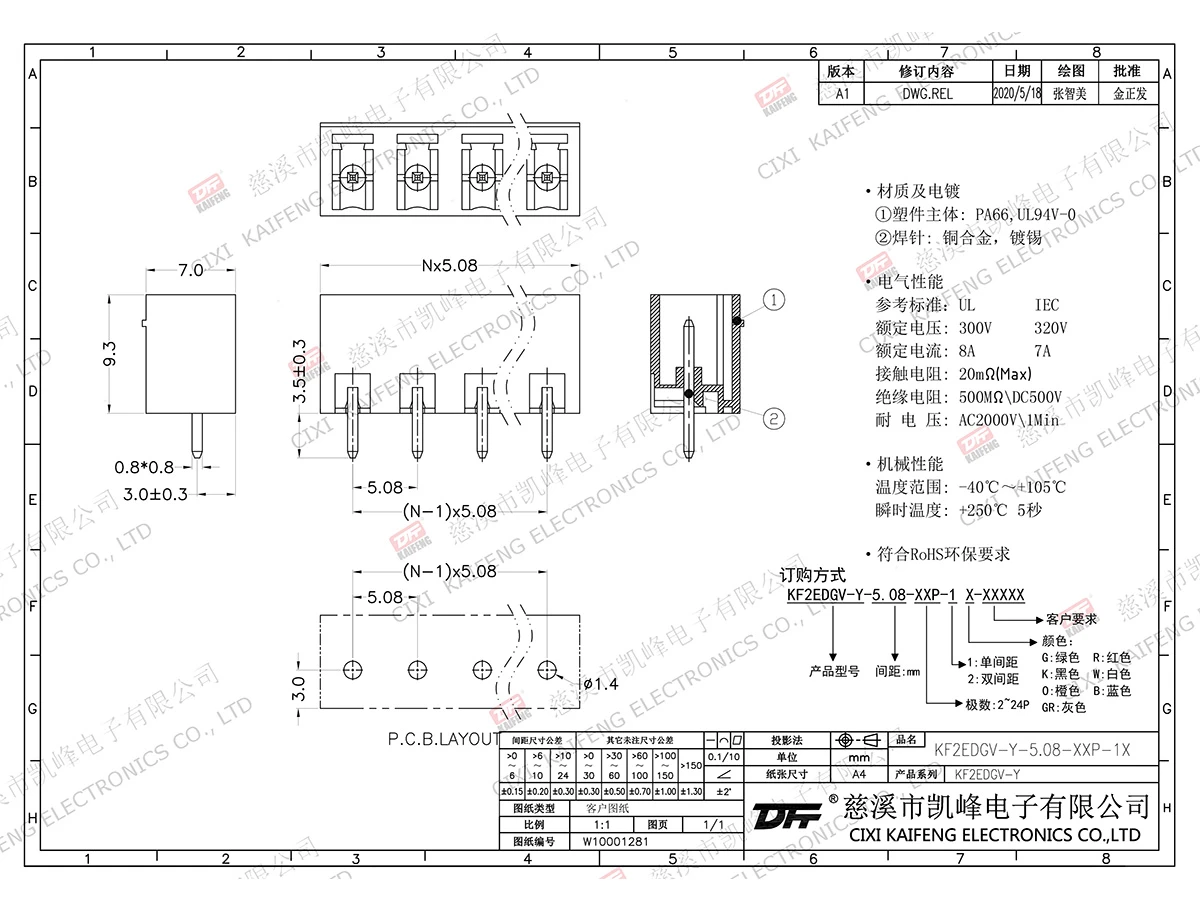 材质电镀:触点: -焊针: 黄铜,镀锡塑件: PA66,UL94V-0电气性能ULIEC额定电压300V 320V 额定电流8A7A接触电阻20mΩ绝缘电阻500MΩ/DC500V耐电压AC2000V/1min使用线径-机械性能温度范围-40℃~+105℃ 瞬时温度+250℃,5sec扭矩-剥线长度-