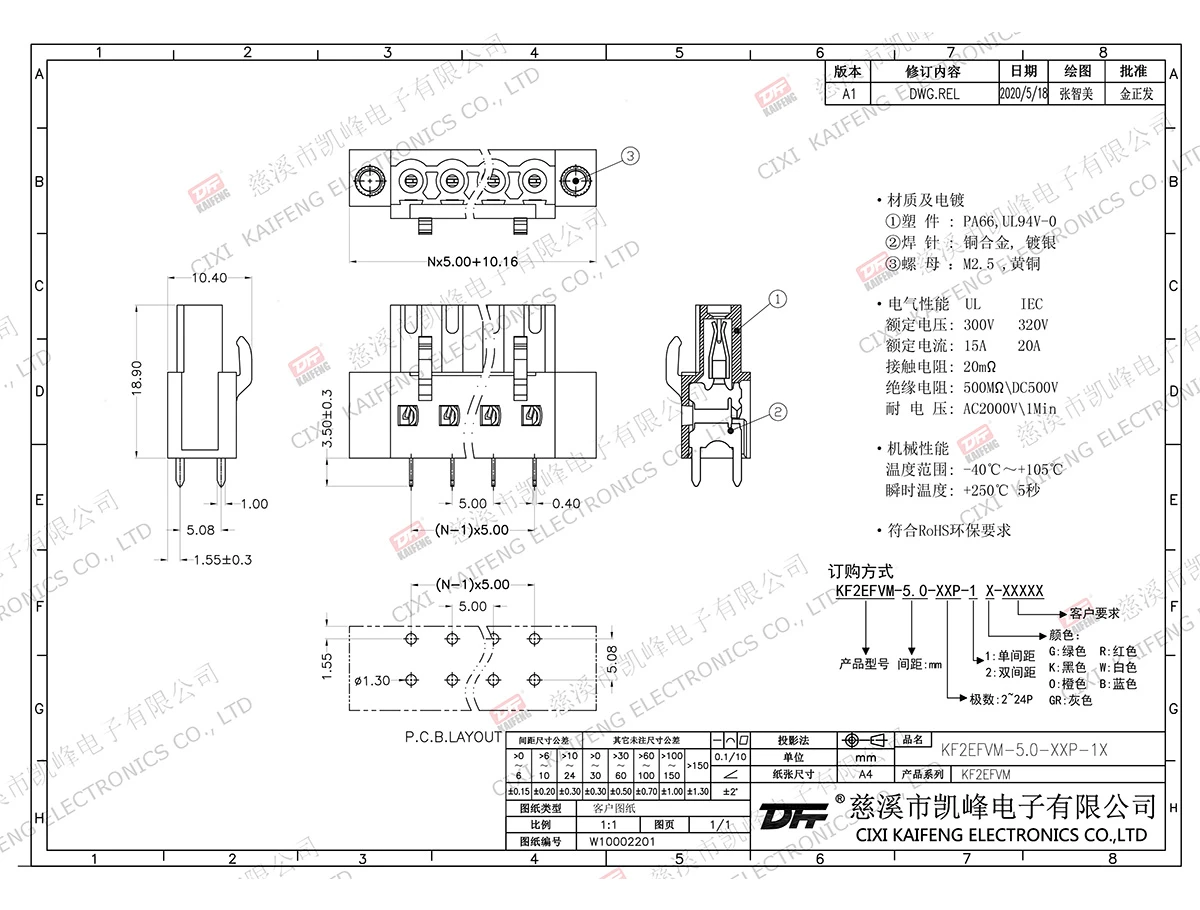 材质电镀:材质及电镀螺丝: -触点: -焊针: 磷青铜,镀锡塑件: PA66,UL94V-0电气性能ULIEC额定电压300V 320V 额定电流15A20A接触电阻20mΩ绝缘电阻500MΩ/DC500V耐电压AC2000V/1min使用线径-机械性能温度范围-40℃~+105℃ 瞬时温度+250℃, 5sec扭矩-剥线长度-
