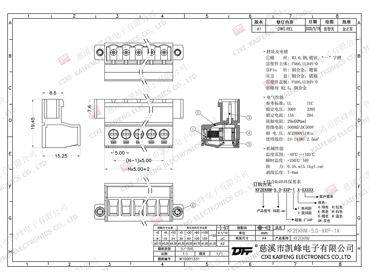 插拔式连接端子 材质电镀:材质及电镀螺丝: M3.0,钢,镀锌触点: 磷青铜焊针: -塑件: PA66,UL94V-0电气性能ULIEC额定电压300V 320V 额定电流15A20A接触电阻20mΩ绝缘电阻500MΩ/DC500V耐电压AC2000V/1min使用线径24-14AWG 2.5mm²机械性能温度范围-40℃~+105℃ 瞬时温度+250℃, 5s