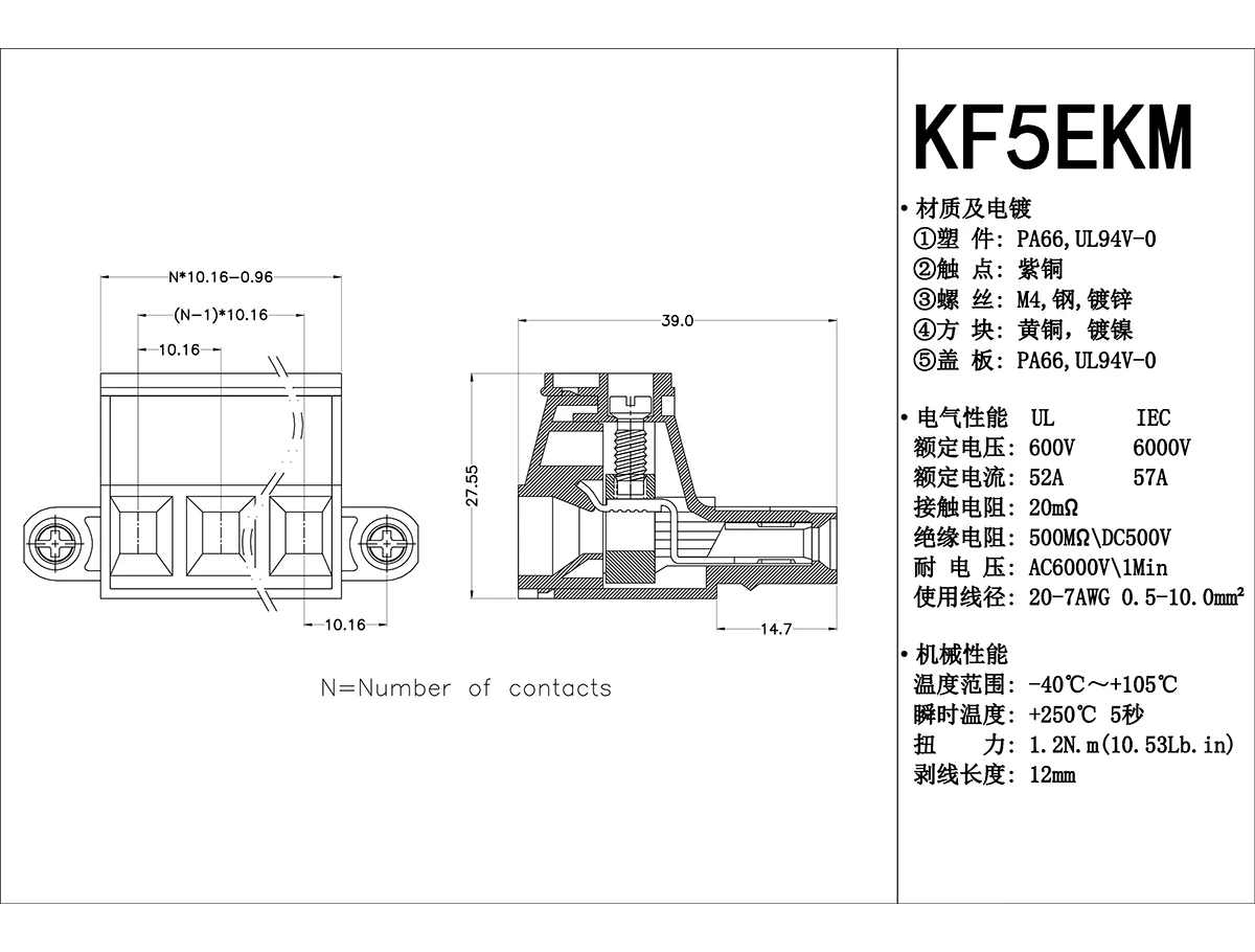 材质电镀:螺丝:M4.0钢,镀锌塑件:PA66,UL94V-0触点:紫铜方块:黄铜,镀锡电气性能ULIEC额定电压600V600V额定电流52A57A接触电阻20mΩ(Max)绝缘电阻500MΩ\DC500V耐电压AC6000V\1Min使用线径20-7AWG0.5-10.0mm²机械性能温度范围-40℃~+150℃瞬时温度+250℃,5sec扭矩1.2N.m10.53Lb.in剥线长度12m