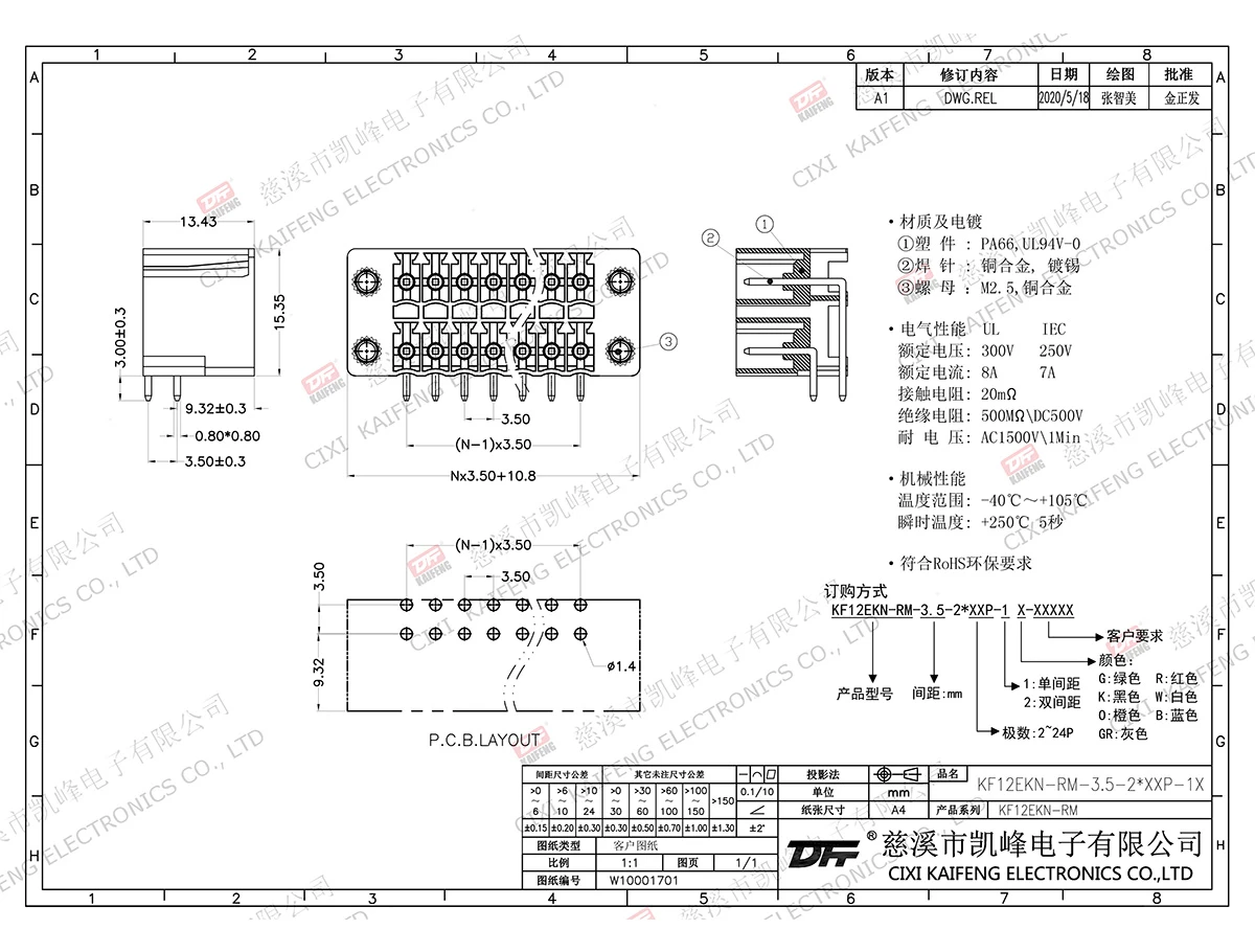 插拔式连接端子 材质电镀:触点: -焊针: 黄铜,镀锡塑件: PA66,UL94V-0电气性能ULIEC额定电压300V 250V 额定电流8A7A接触电阻20mΩ绝缘电阻500MΩ/DC500V耐电压AC2000V/1min使用线径-机械性能温度范围-40℃~+105℃ 瞬时温度+250℃, 5sec扭矩-剥线长度-