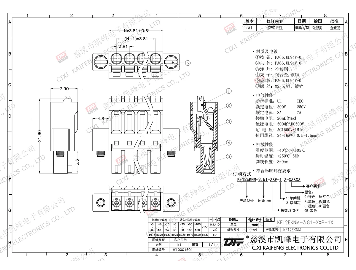 插拔式连接端子 材质电镀:触点:磷青铜,焊针:-塑件:PA66,UL94V-0电气性能ULIEC额定电压300V250V额定电流8A7A接触电阻20mΩ绝缘电阻500MΩ/DC500V耐电压AC1500V/1min使用线径28-16AWG0.5-1.5㎜²机械性能温度范围-40℃~+105℃瞬时温度+250℃,5sec扭矩-剥线长度8-9mm