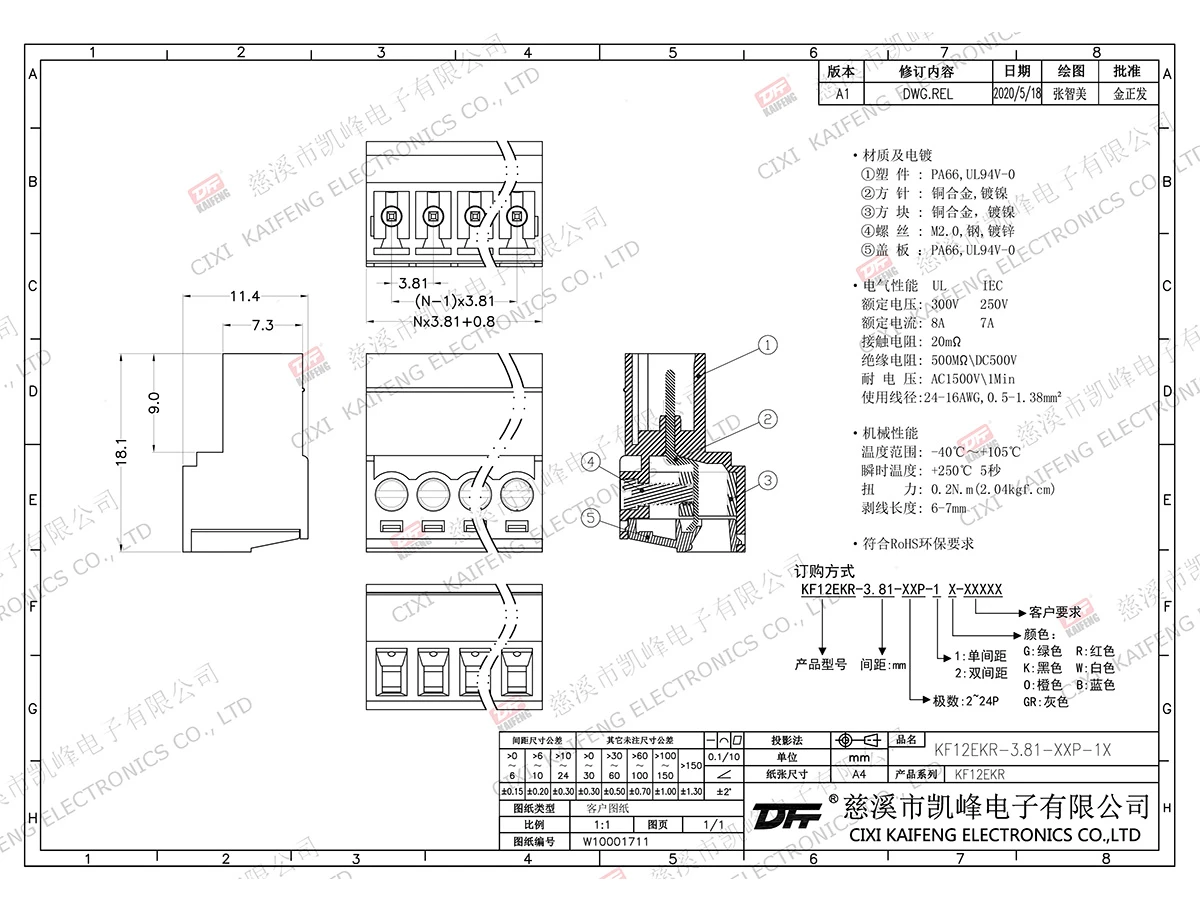 材质电镀:M2.5,钢,镀锌夹子:磷青铜,镀镍触点:黄铜,镀镍塑件:PA66,UL94V-0电气性能ULIEC额定电压300V250V额定电流8A7A接触电阻20mΩ绝缘电阻500MΩ/DC500V耐电压AC1500V/1min使用线径26-28AWG0.5-1.5mm²机械性能温度范围-40℃~+105℃瞬时温度+250℃,5sec扭矩0.2N.m2.4kgf.cm剥线长度6-7mm