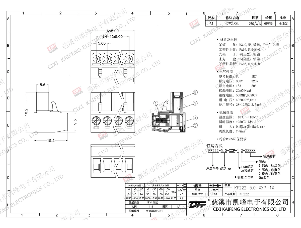 材质电镀:材质及电镀螺丝: M2.5,钢,镀锌触点: 磷青铜焊针: -塑件: PA66,UL94V-0电气性能ULIEC额定电压300V 320V 额定电流15A20A接触电阻20mΩ绝缘电阻500MΩ/DC500V耐电压AC2000V/1min使用线径28-12AWG 2.5mm²机械性能温度范围-40℃~+105℃ 瞬时温度+250℃, 5s