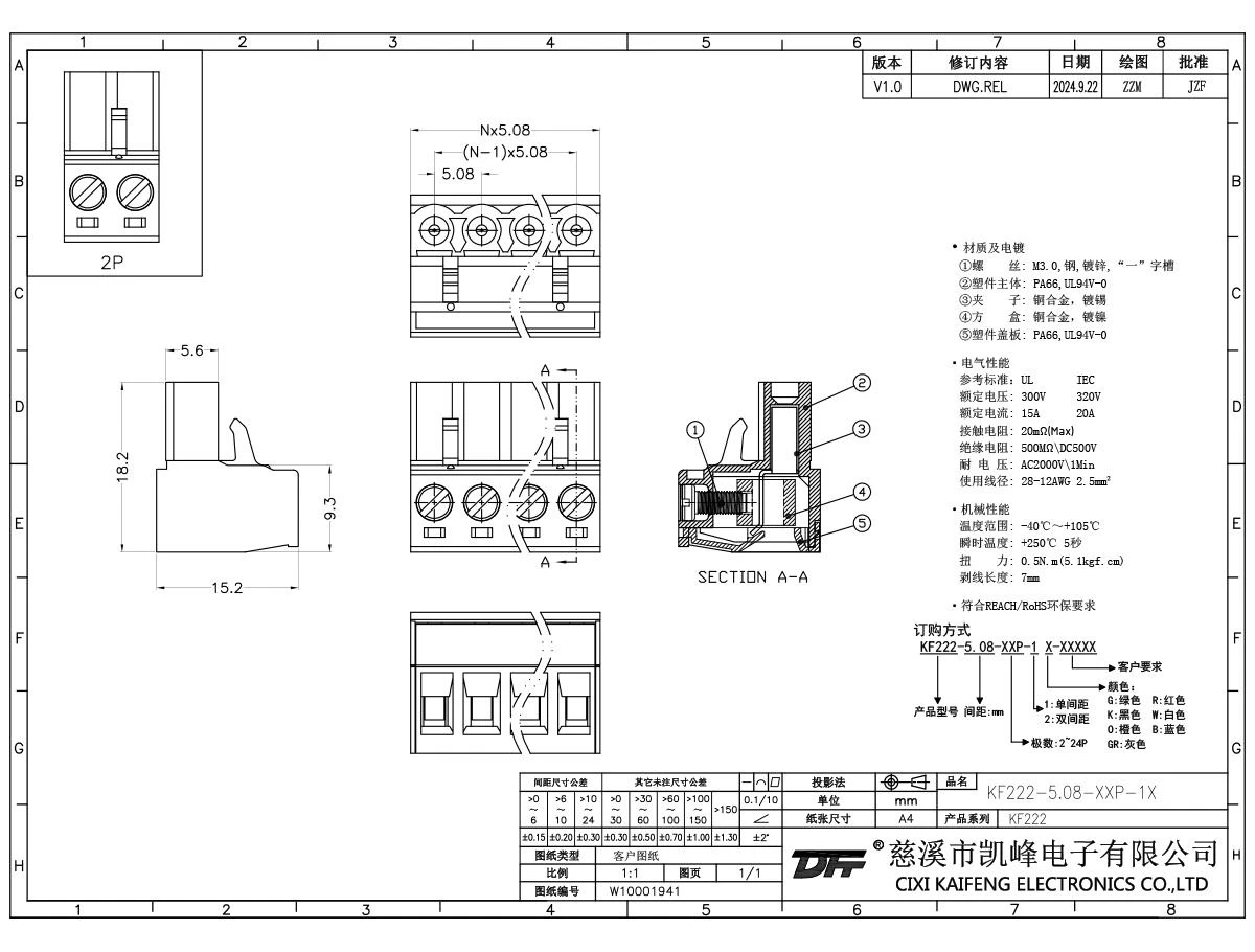 插拔式连接端子 材质电镀:材质及电镀螺丝: M2.5,钢,镀锌触点: 磷青铜焊针: -塑件: PA66,UL94V-0电气性能ULIEC额定电压300V 320V 额定电流15A20A接触电阻20mΩ绝缘电阻500MΩ/DC500V耐电压AC2000V/1min使用线径28-12AWG 2.5mm²机械性能温度范围-40℃~+105℃ 瞬时温度+250℃, 5s